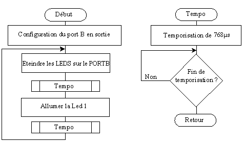 ;**************************************** ;*Faire clignoter la LED 1 sur le PortB * ;**************************************** ; fichier 4_ledcli.asm ; Le clignotement n'est pas visible a l'oeil nu ; un oscilloscope sur la sortie clignotante permet de s'assurer du clignotement de la LED ; On pourra verifier aussi la mesure du temps à l'oscilloscope ; La comparer au calcul effectue ; ; ; Device = 16F84 ; Utilisation du circuit 16F84 ; Horloge = XT ; Déclaration et config du Circuit ; Equivalence registres ;*********************** PORTB equ 0x0006 ; Adresse du portb TRISB equ 0x0086 ; Adresse du registre de direction du porta STATUS equ 0x0003 ; Le bit 5 permet d'acceder à la Banque 1 ou 0 ; ce qui donne acces au TRIS ou au PORT ;* Reservation memoire * ;*********************** ; Les registres occupent la RAM jusqu'en OBh COMPT equ 0Ch ;*************** ;Initialisation* ;*************** org 00h ; Apres le reset le PC pointe l'adresse 00 goto debut ; On saute les 5 premiers octets car à l'adresse ; 04 on a l'adresse d'interruption ; On prend l'habitude de ne pas ecrire sur ce segment ; en sautant simplement jusqu'apres ce segment org 05h debut clrf PORTB ; Mise a zero des latches de sorties bsf STATUS,05 ; Selection de Bank 1 pour l'accès au TRIS movlw 00h ; movwf TRISB ; Declaration du portb en sortie bcf STATUS,05 ; Selection de Bank 0 pour l'accès au PORT ;********************* ;Programme principal * ;********************* boucle clrf PORTB ; Extinction de toutes les LEDS call tempo movlw 01h movwf PORTB ; on inverse l'etat de la LED 1 call tempo goto boucle ; recopie permanente ;****************** ;Sous Programmes * ;****************** tempo movlw 0x00ff ; chargement de COMPT de la valeur maximale movwf COMPT delai decfsz COMPT,1 ; Le temps de decompter 256 valeurs goto delai ; calcul du temps : 1 instruction =Tquartz/4=1µs =1 cycle ; l'instruction decfz est de 2 cycles ; 2 instructions = 3 µs repeter 256 fois t=768µs return end1-5) Clignotement d'une seule LED sur un port en sortie à l'aide d'une tempo par boucles imbriquées
